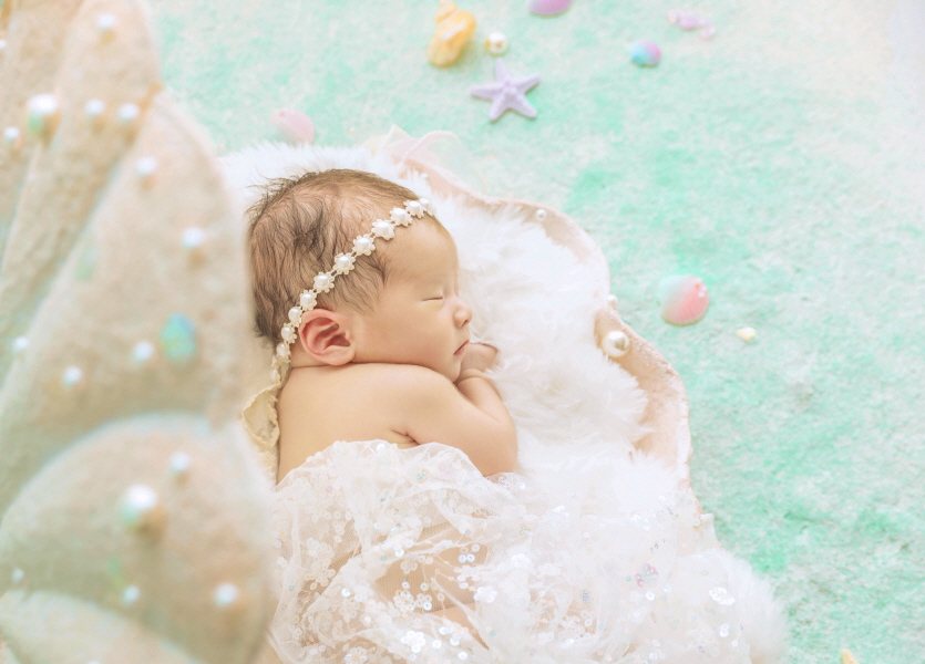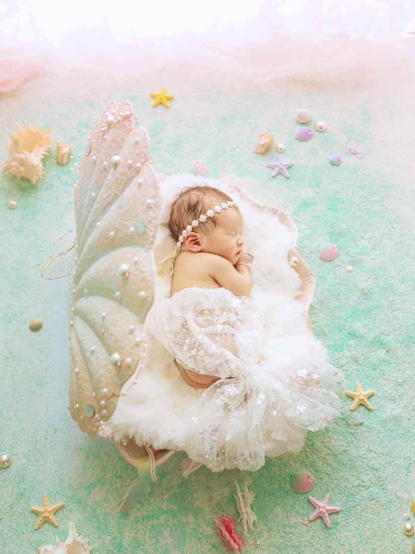 '예쁜 조개침대' 위에 누운 아기와 '반짝이는 진주 별'들이 어우러진,