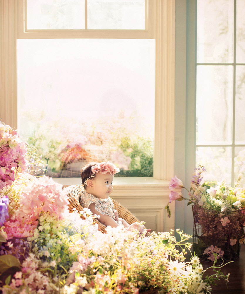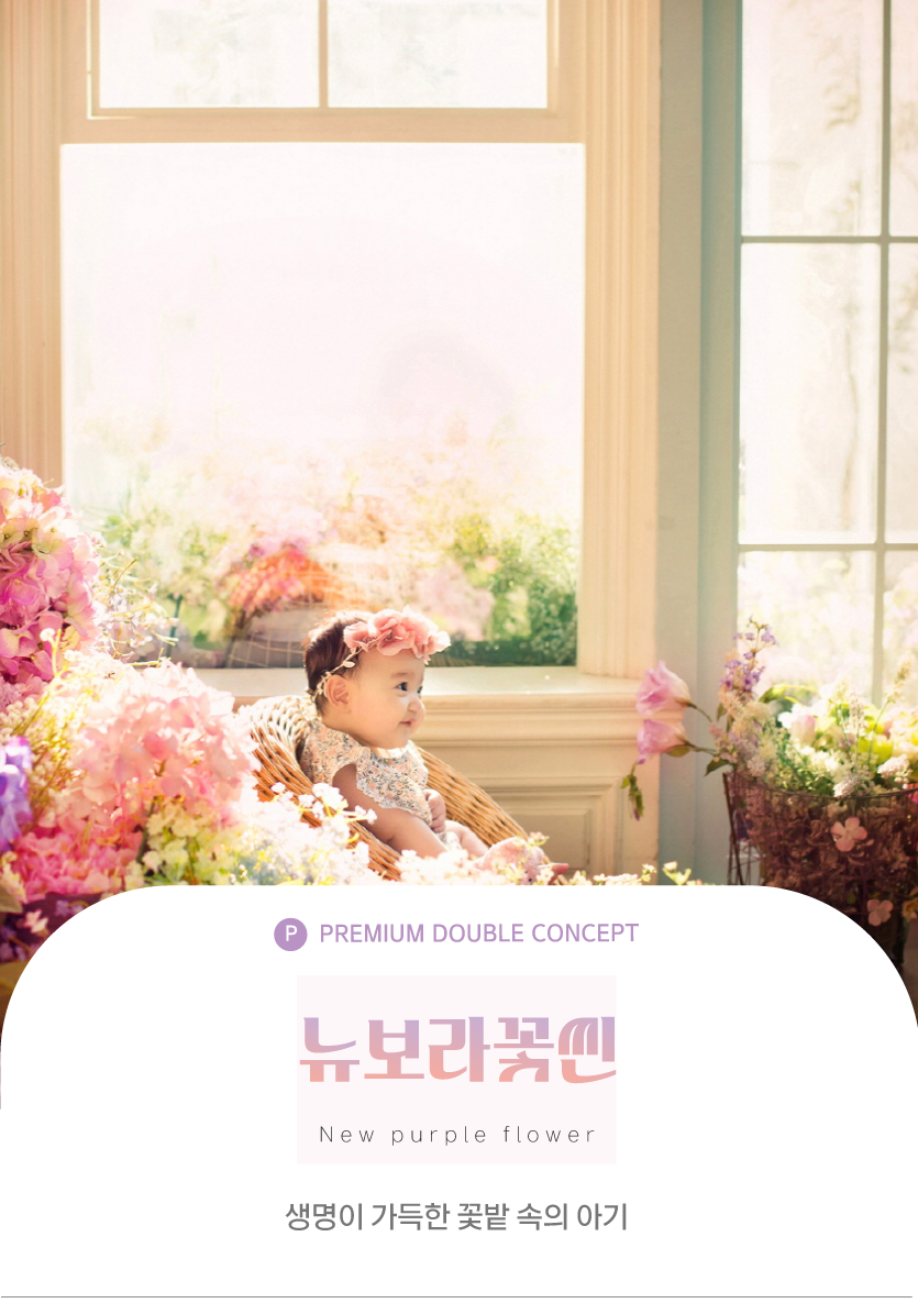 뉴보라꽃씬 백일사진 컨셉은 보라색 꽃밭 속에서