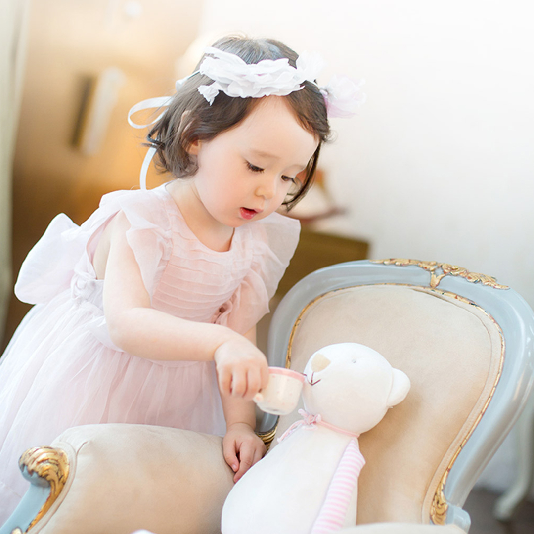 퓨어한 화이트 드레스와 레이스 보넷과 헤어밴드 연출로
