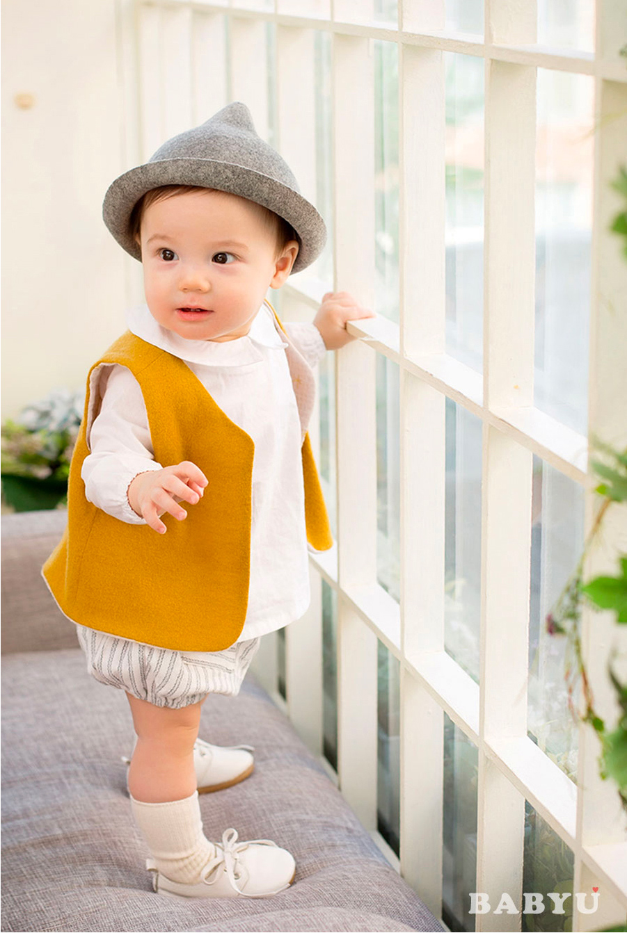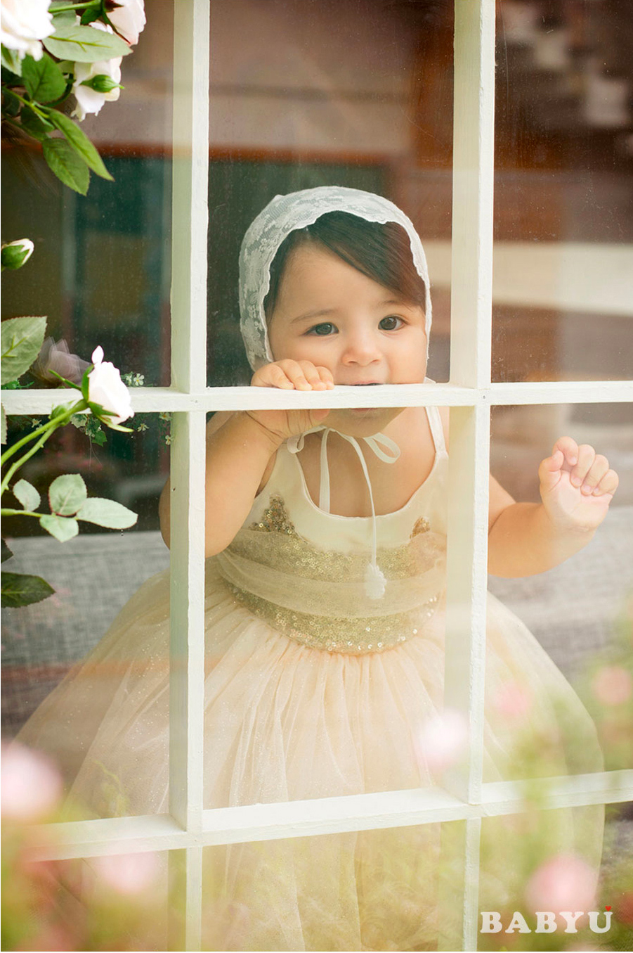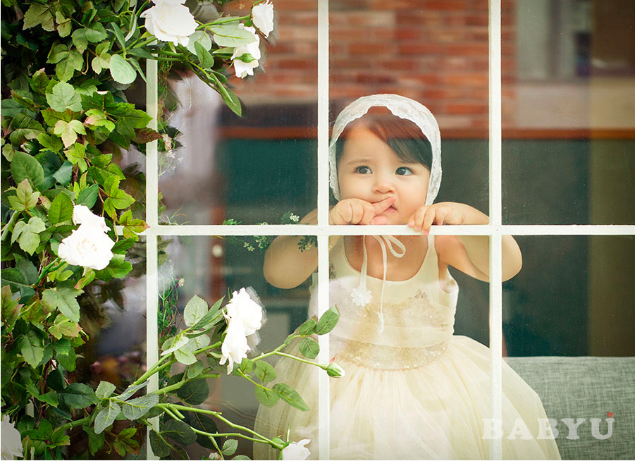 아기는 창 너머로 세상을 호기심 가득한 눈으로 바라보며,